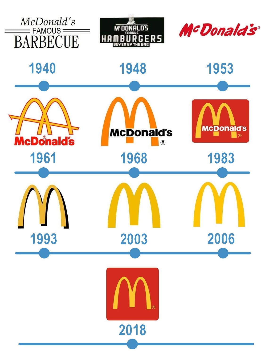 Le premier logo du restaurant McDonald’s intégrait un mot-symbole de couleur noire, établi sur trois différents styles et niveaux. La partie supérieure du logo intègre l’inscription « McDonald’s » sous une police en italique, à la fois traditionnelle et élégante. Le terme « Famous » écrit en lettres majuscules et avec une police sans-serif était positionné au milieu du logo. L’inscription « Barbecue » a quant à elle été écrite dans une police sérif, à la fois solide et stricte et était positionnée à la partie inférieure du logo. On note d’ailleurs que c’est l’élément principal du premier logo.
